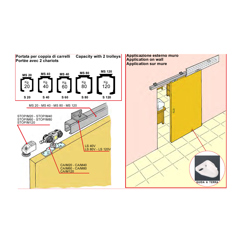 Kit Monosilent KS80/D per ante scorrevoli, applicazione esterno muro, misura monorotaia 230, portata 80 kg